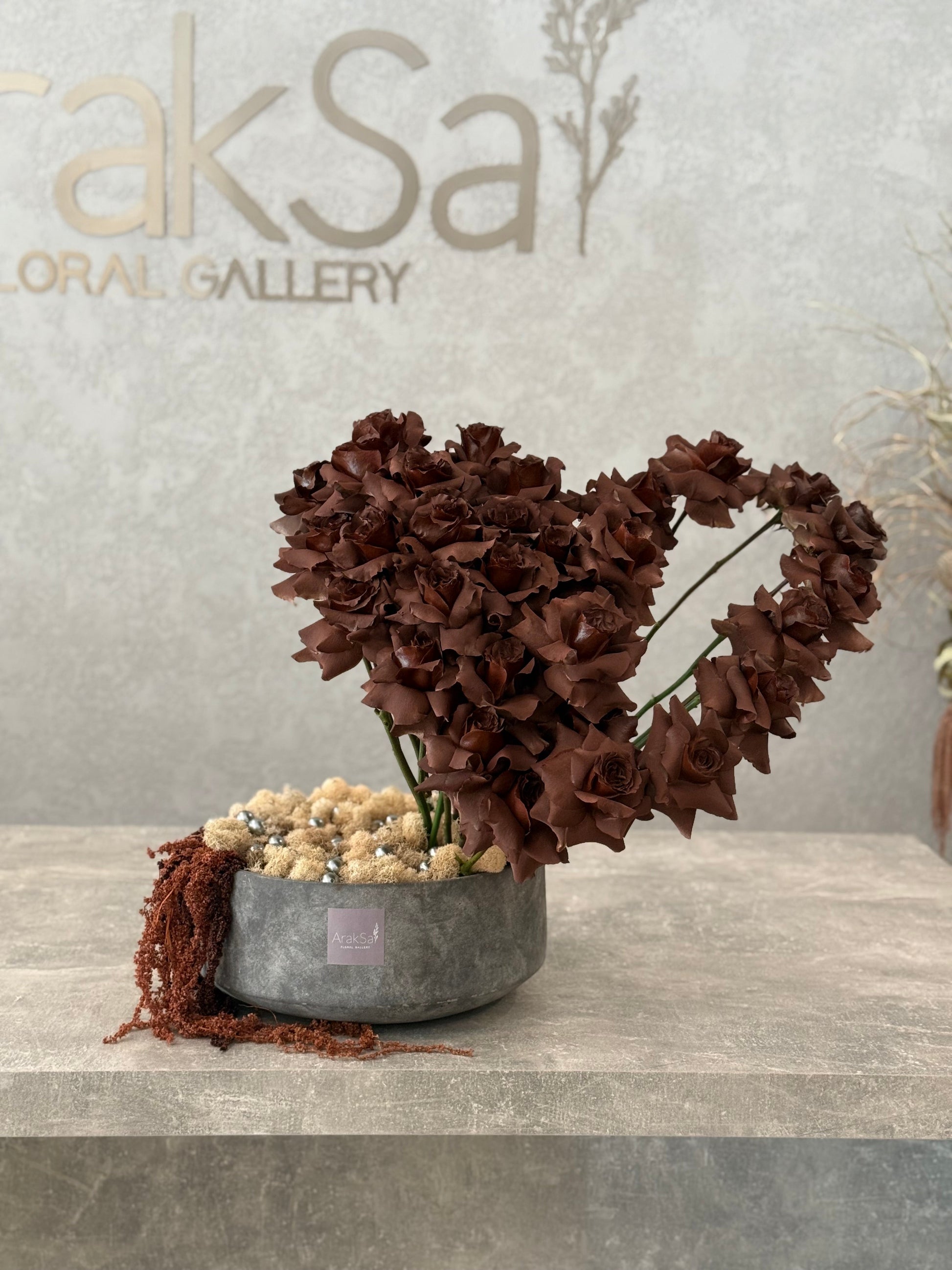 ArakSa's Signature brown hand painted heart presents a masterfully composed fresh floral arrangement featuring rich, earthy tones. This distinctive heart-shaped design combines premium 40-50 roses, with expert structural techniques to ensure optimal vase life. The arrangement's sophisticated color palette and meticulous balance reflect professional floristry standards while providing a unique aesthetic statement for discerning clients seeking exceptional quality.
